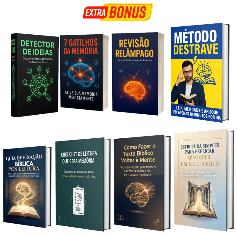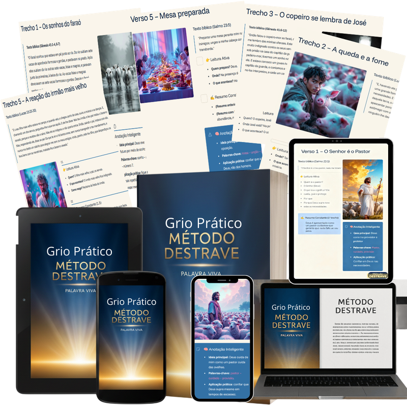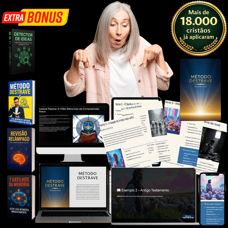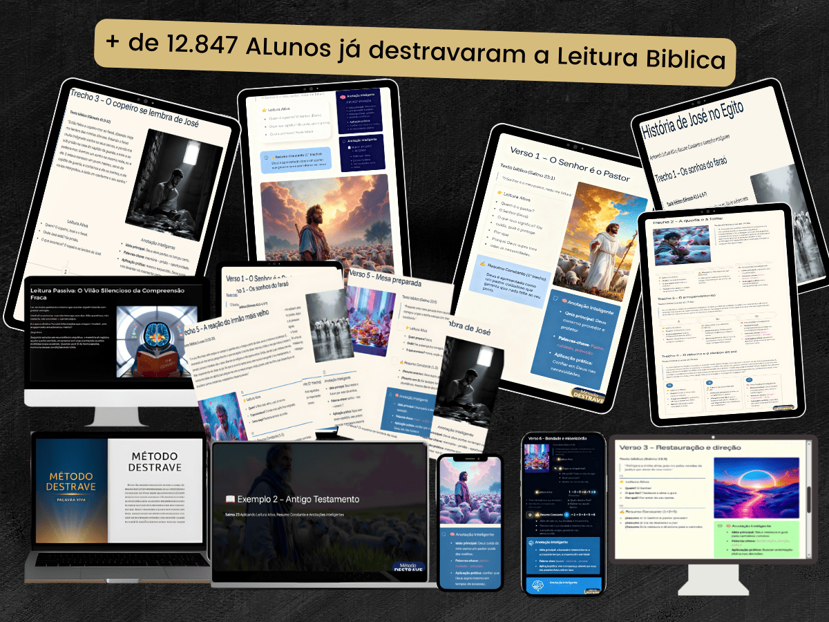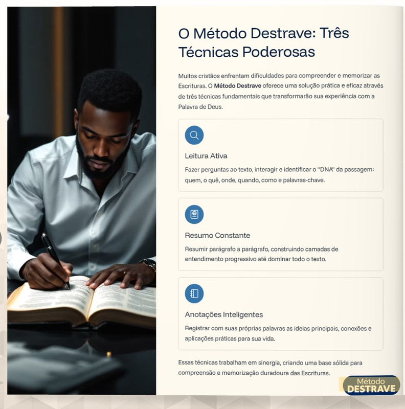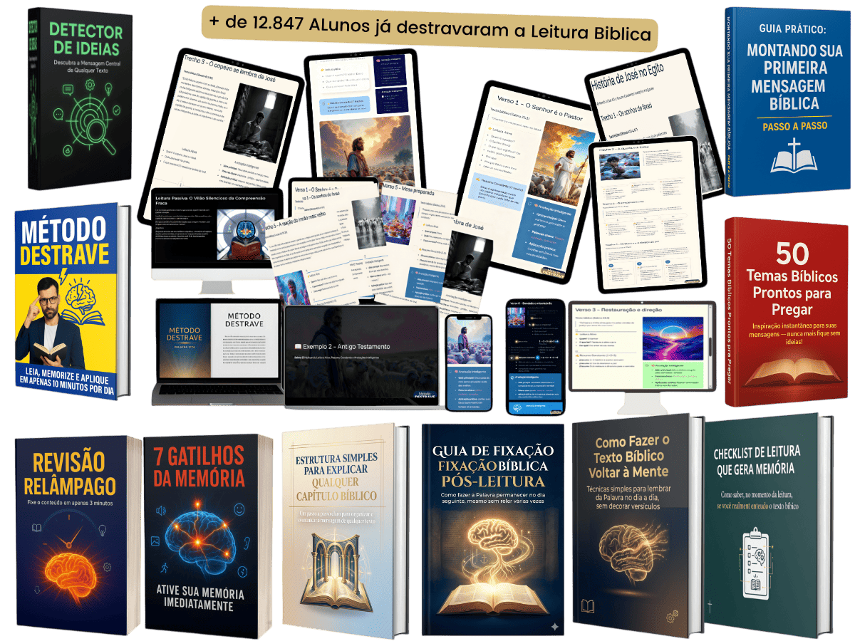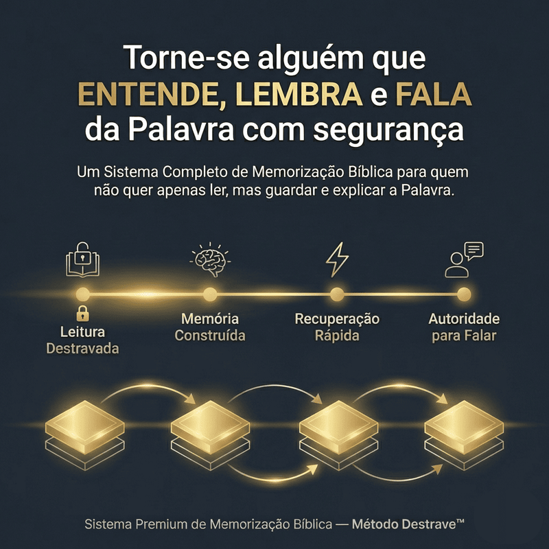 Use o Método Destrave, um protocolo visual e prático De 17 Minutos para aplicar junto com a Bíblia, organizar e memorizar o texto na mesma leitura e explicar qualquer capítulo sem travar.