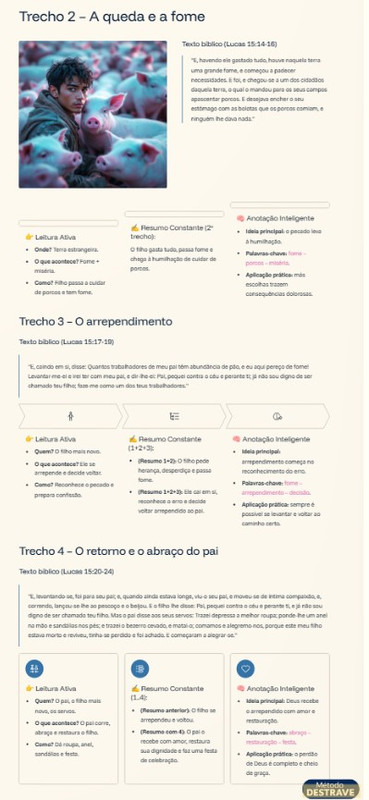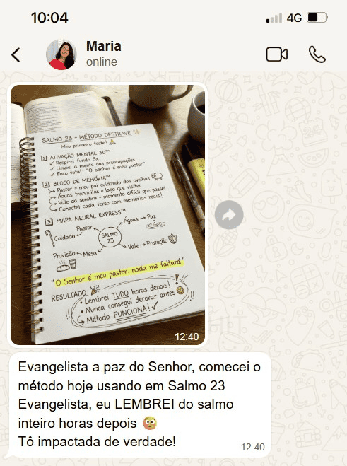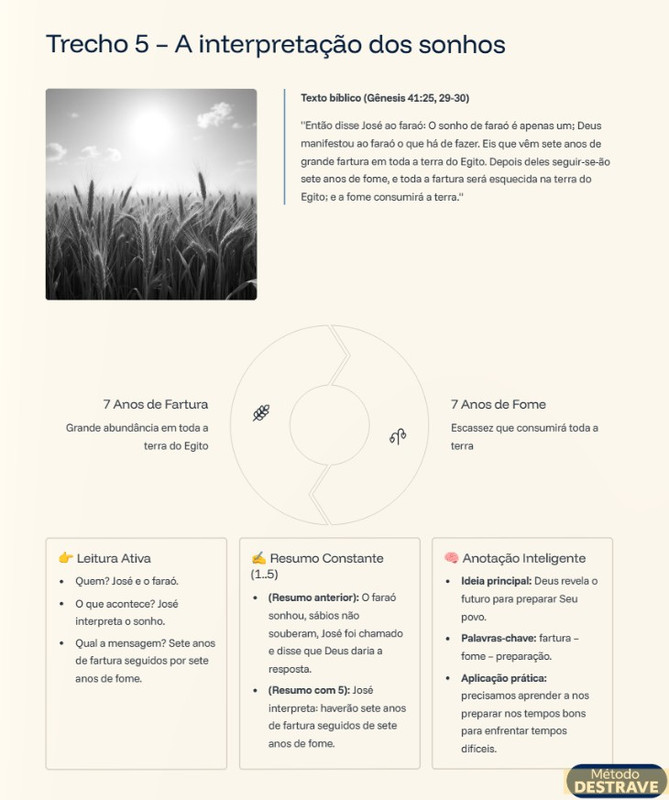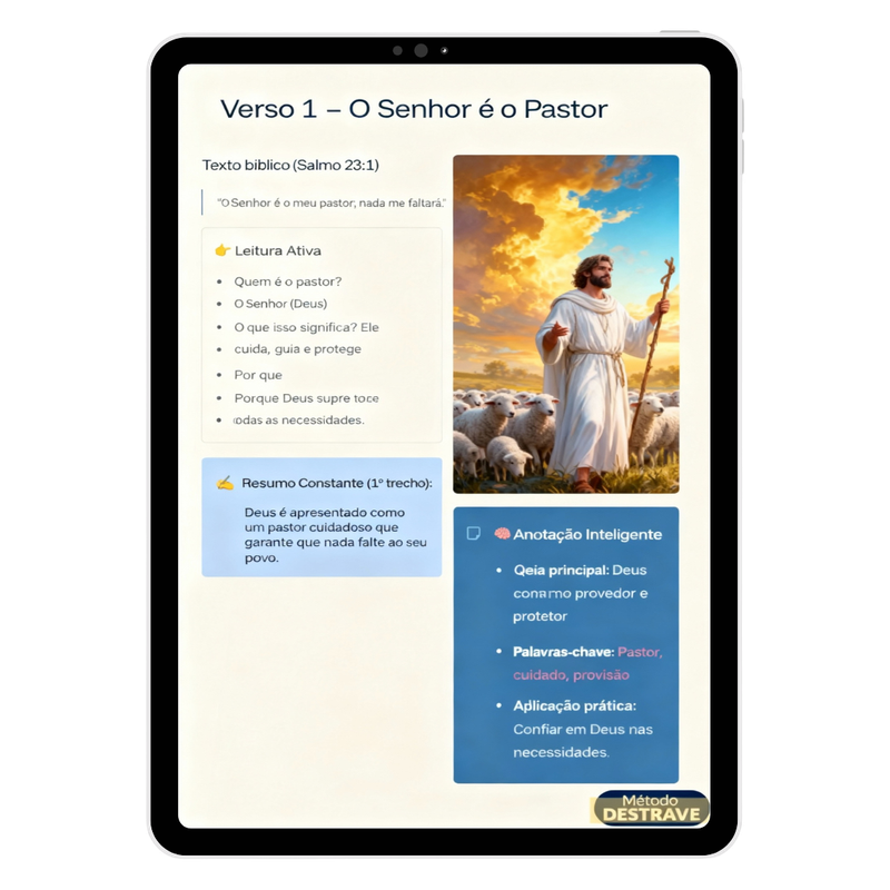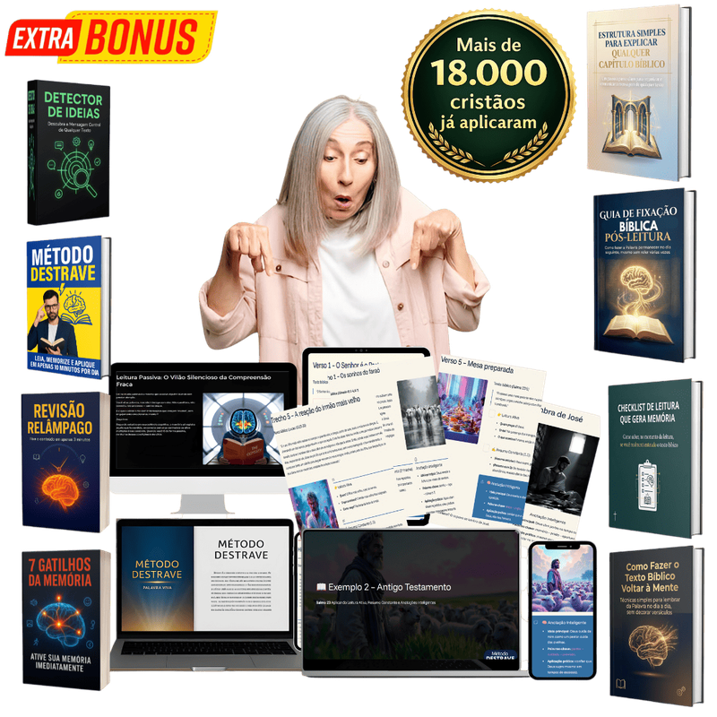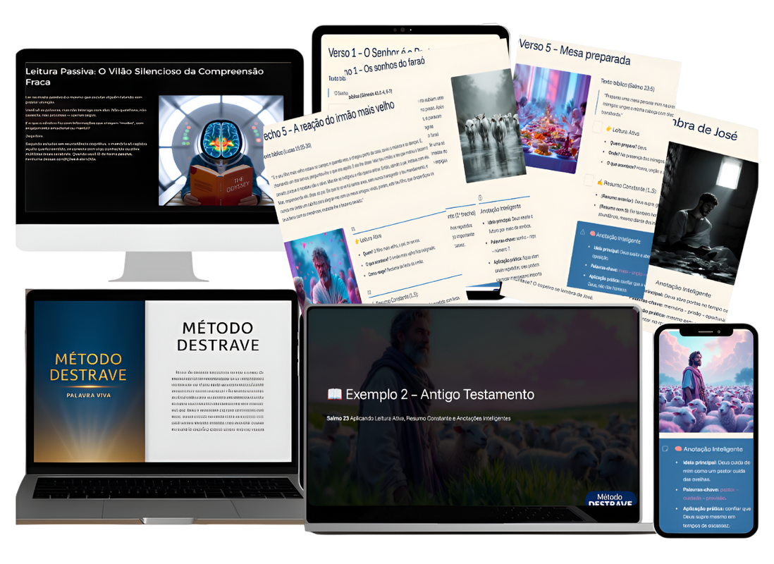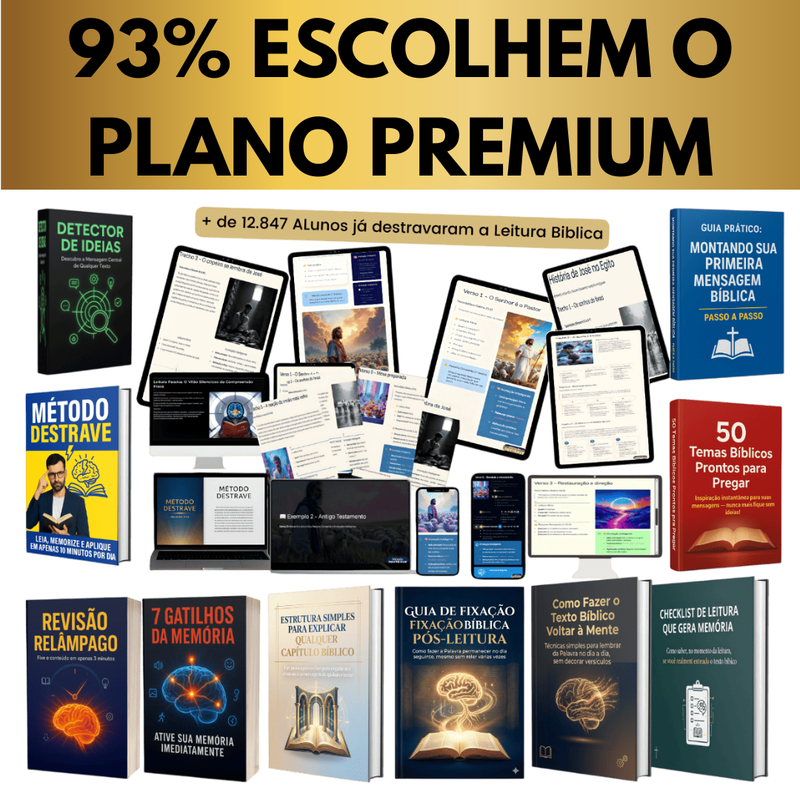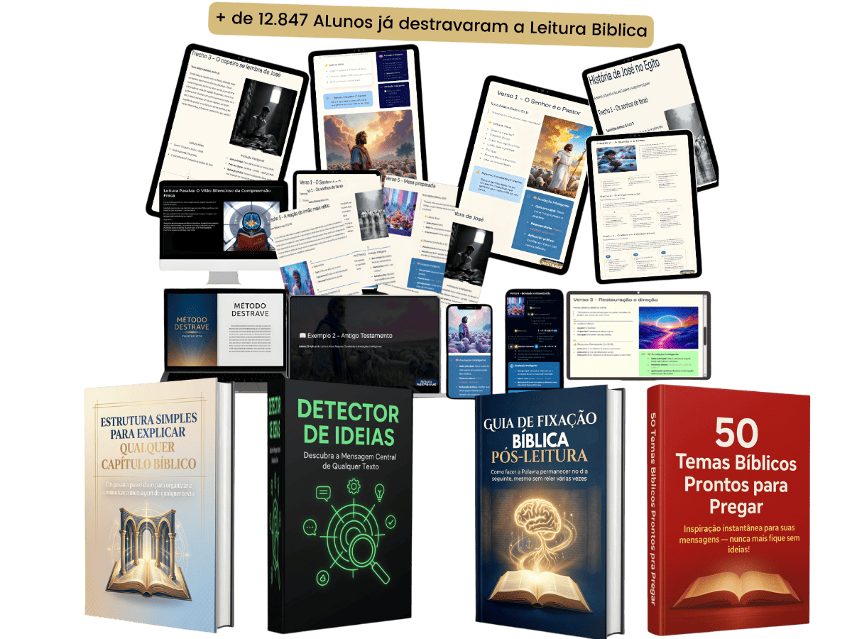 Use o Método Destrave, um protocolo visual e prático De 17 Minutos para aplicar junto com a Bíblia, organizar e memorizar o texto na mesma leitura e explicar qualquer capítulo sem travar.