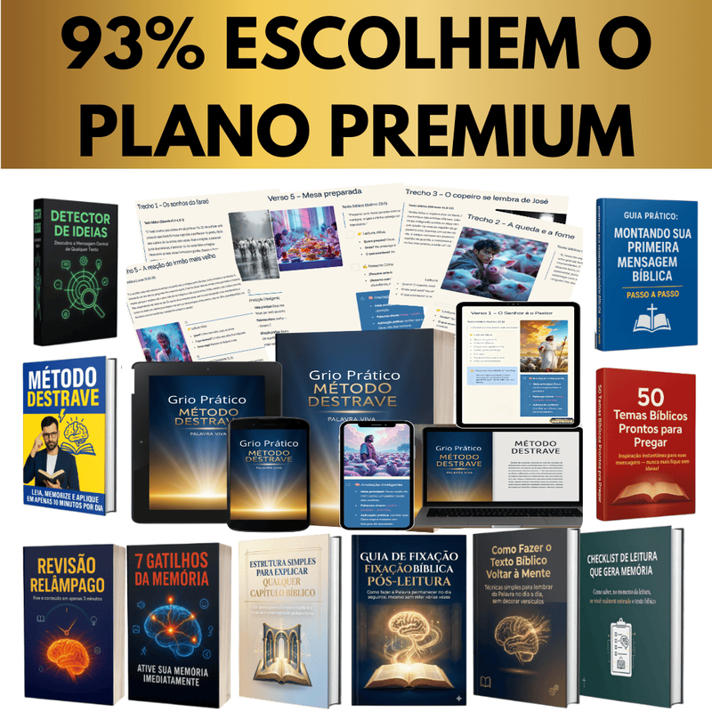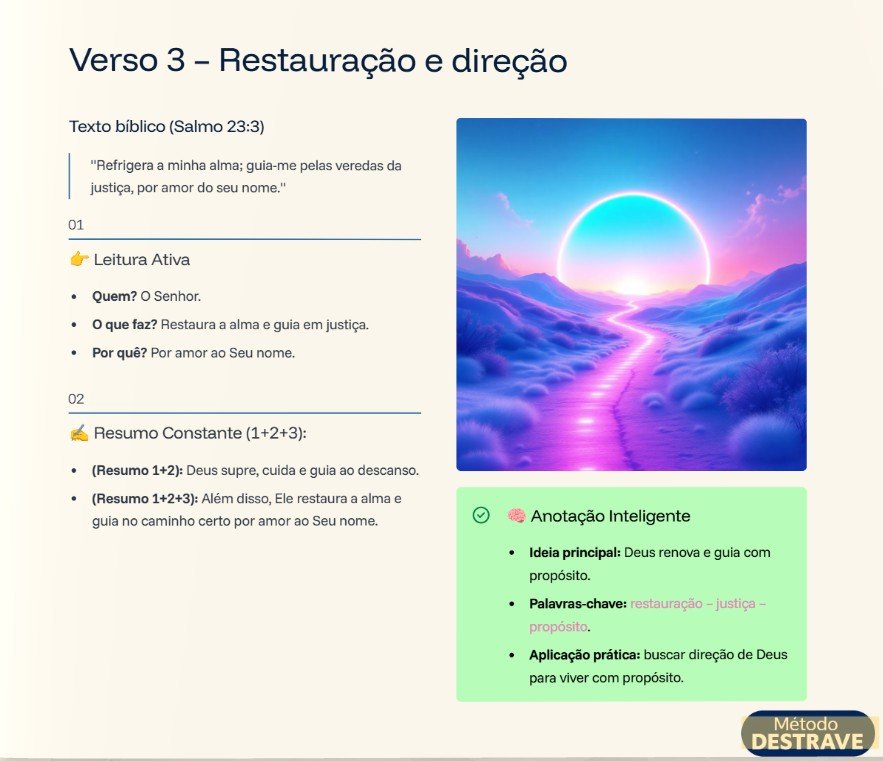 Use o Método Destrave, um protocolo visual e prático De 17 Minutos para aplicar junto com a Bíblia, organizar e memorizar o texto na mesma leitura e explicar qualquer capítulo sem travar.